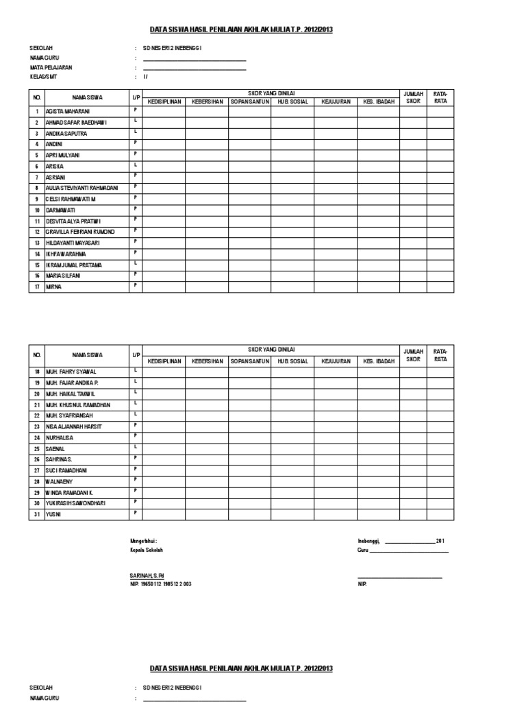 Instrumen Penilaian Akhlak Dan Kepribadian Siswa. Format analisis ulangan harian dengan excel Contoh format rencana kegiatan remedial; Format data penilaian akhlak dan kepribadian siswa; Melaporkan hasil penilaian mata pelajaran pada setiap akhir semester kepada kepala sekolah dalam bentuk laporan prestasi hasil belajar siswa. Doc penilaian akhlak mulia dan kepribadian untuk walas. Penilaian mempunyai peran yang penting dalam proses pembelajaran, sesuai dengan fungsi, tujuan dan prinsip penilaian. Skripsi yang berjudul implementasi pembelajaran akidah akhlak dalam pengembangan kepribadian siswa di mts pab 2 sampali, adalah sebuah usaha kecil dan sederhana yang disusun penulis untuk memenuhi tugas dan melengkapi syarat. Hasil penilaian akhlak mlia dan kepribadian digunakan untuk menyimpulkan penilaian sikap sebagai salah satu syarat kelulusan. Program evaluasi kelas 2 sd kurikulum 2013 tahun pelajaran 2020 2021. Penilaian akhlak mulia dilakukan oleh guru mata pelaaran agama dan guru mata pelajaran lain melalui pengamatan, inventori, wawancara, atau bentuk lain yang relevan 2. Contoh berita acara rapat pembentukan panitia ujian uts; Kelompok mata pelajaran agama dan akhlak mulia. Dalam blog ini saya juga sediakan berbagai format raport dan aplikasi raport kurikulum 2013. C) melakukan perbaikan kegiatan pembelajaran. Daftar nilai akhlak dan nilai kepribadian tersebut akan digunakan guru pkn dan agama untuk bahan pertimbangan dalam menentukan nilai akhir siswa.