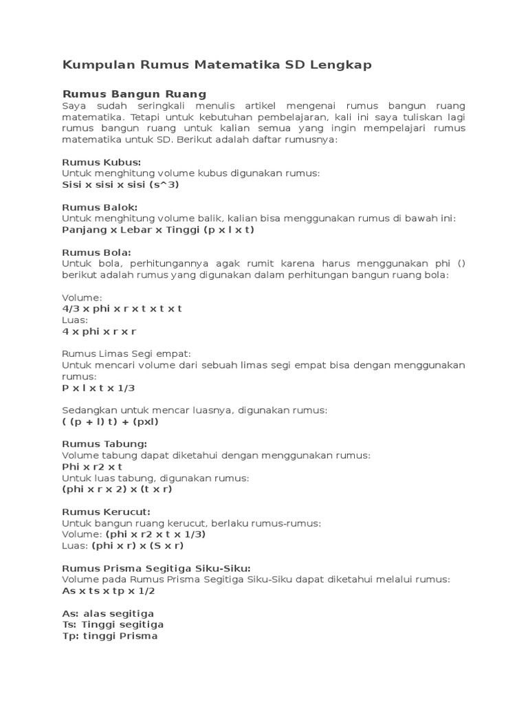Mulai dari rumus bangun ruang, bangun datar, bilangan, dan sebagainya ada dalam aplikasi ini. Masih seputar rumus matematika sd yang membahas mengenai. Sifat komutatif penjumlahan, rumus bentuk umum : 3 x 5 = 5 x 3 = 15 atau 10 x 2 = 2 x 10 = 20. Kumpulan materi rumus matematika untuk sd kelas 6 yang akan dibahas disini antara lain rumus volume bangun ruang, rumus skala, rumus menghitung luas bangun datar, rumus operasi bilangan bulat, rumus operasi hitung bilangan campuran, rumus fpb dan kpk dua bilangan, mengolah dan menyajikan data, sistem koordinat dan rumus volume dan waktu. Kenapa disebut lengkap karena di dalamnya terdapat semua rumus matematika untuk sekolah dasar (sd), smp, hingga rumus matematik sma. Semuanya disajikan lengkap dengan contoh soal beserta pembahasannya. Kumpulan rumus matematika sma bersama q&a cerdaskan bangsa! Tetapi untuk kebutuhan pembelajaran, kali ini saya tuliskan lagi rumus bangun ruang untuk kalian semua yang ingin mempelajari rumus matematika untuk sd.