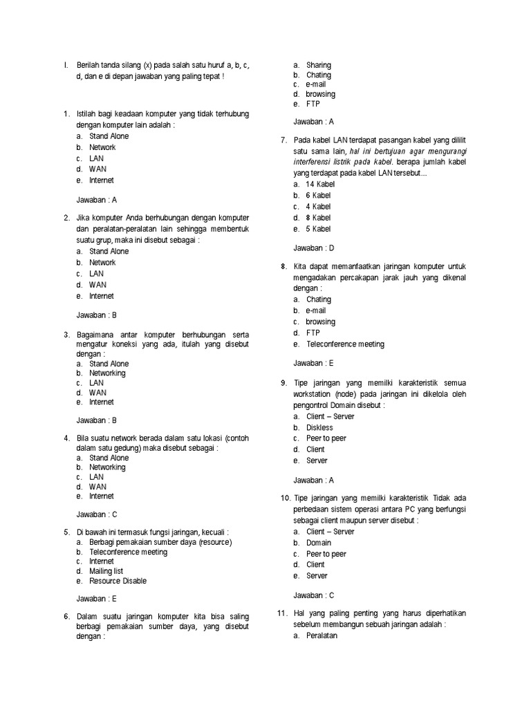 Soal dan jawaban jaringan komputer. Melakukan perbaikan dan atau setting ulang koneksi jaringan berbasis luas wide area network 1. Syarif muhammad abdillah april 04, 2019. Teknologi layanan jaringan smk/mak kelas xi kompetensi keahlian teknik. Soal dan jawaban melakukan instalasi perangkat jaringan berbasis luas wan. Contoh soal uraian dan jawaban instalasi perangkat. Contoh soal teknologi jaringan berbasis luas wan , home soal produktif tkj 30 soal instalasi perangkat jaringan berbasis luas lan wan contoh dalam satu gedung maka disebut sebagai a stand alone b networking 1 response to 30 soal instalasi perangkat jaringan berbasis luas lan wan jimmy neutron 6 september 2019 23 36 makasih min solder uap balas. Aberilah tanda silang pada huruf abcd atau e didepan jawaban yang paling tepat. Can someone help me with my essay? there is nothing terrifying about you having no idea of how to start soal essay dan.