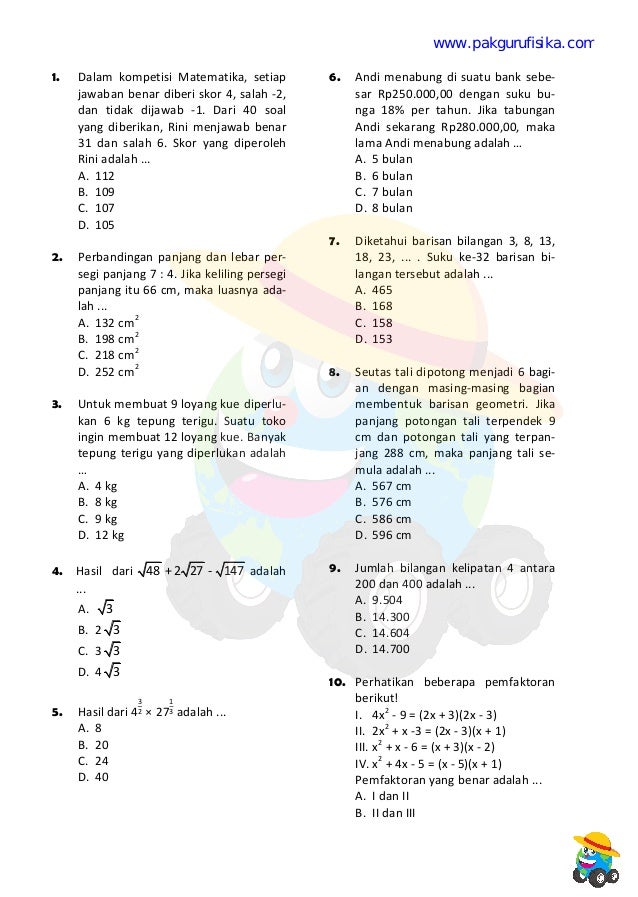 Pembahasan soal 'bocoran' prediksi un mtk smp/mts tahun 2018 dengan cara mudah, cepat, dan praktis. Download prediksi soal dan kunci jawaban us / un matematika smp tahun 2018 atau tahun pelajaran 2017/2018 paket 1 ( klikdisini ) 2. Kumpulan link download soal latihan un smp /mts 2016. Soal un/unbk matematika yang saya bagikan ini hanya sebatas prediksi bukan merupakan soal. Prediksi soal usbn prakarya smp 2018/2019 dan kunci jawabannya ini merupakan update terbaru yang akan kami bagikan dalam kesempatan yang b. Soal un matematika smp by guru dadang posted on january 18 2020 january 18 2020 download prediksi soal dan contoh soal un matematika smp dan pembahasannya kurikulum tahun ajaran baru 2020 2021 lengkapi dengan soal pilihan ganda tingkat sekolah. Pada prediksi soal un matematika smp 2018 sesuai kisi kisi bagian 3 ini berisi materi tentang. Berikut ini contoh prediksi atau latihan soal un tahun 2018/2019 atau tahun pelajaran 2018/2019 yang diharapkan dapat membantu mempersiapkan para siswa smp menghadapi un tahun 2019 atau tahun pelajaran 2018/2019. Pada postingan kali ini saya akan bagikan ringkasan materi matematika smp lengkap dari kelas 7 sampai kelas 9 yang dapat anda gunakan sebagai bahan bacaan dan tambahan referensi untuk mengerjakan latihan soal. Pembahasan soal ini diambil dari simulasi/try out/ uji co.