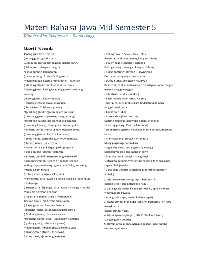 Contoh soal bahasa jawa kelas 5 semester 1 kurikulum 2013. Dalam proses kegiatan belajar mengajar agar bisa berjalan baik maka harus didukung oleh banyak hal. Materi bahasa jawa kelas 5 sd semester 2. Kerata basa yaiku negesi tembung saka wandane ( mengartikan kata dilihat dari suku katanya). Kherysuryawanid rangkumanringkasan materi bahasa indonesia kelas 10 sma bab 1 menyusun laporan hasil observasi untuk pembelajaran di semester 1. 34 full pdfs related to this paper. Wenehana tandha ping x aksara a b c utawa d sangarepe pratelan sing bener. Aksara jawa dan pasangan aksara jawa ha sampai dengan. Piring = sepine yen miring.
