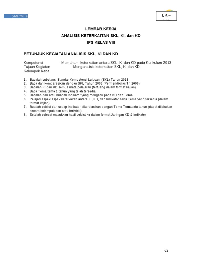 Analisis Keterkaitan Skl, Ki, Dan Kd Smp Kelas 9 Smp/Mts Sudah Digunakan Semenjak Sistem Pendidikan Indonesia Masih Berada Pada Tahap Ktsp, Sampai Dengan Kurikulum 2013 Revisi.